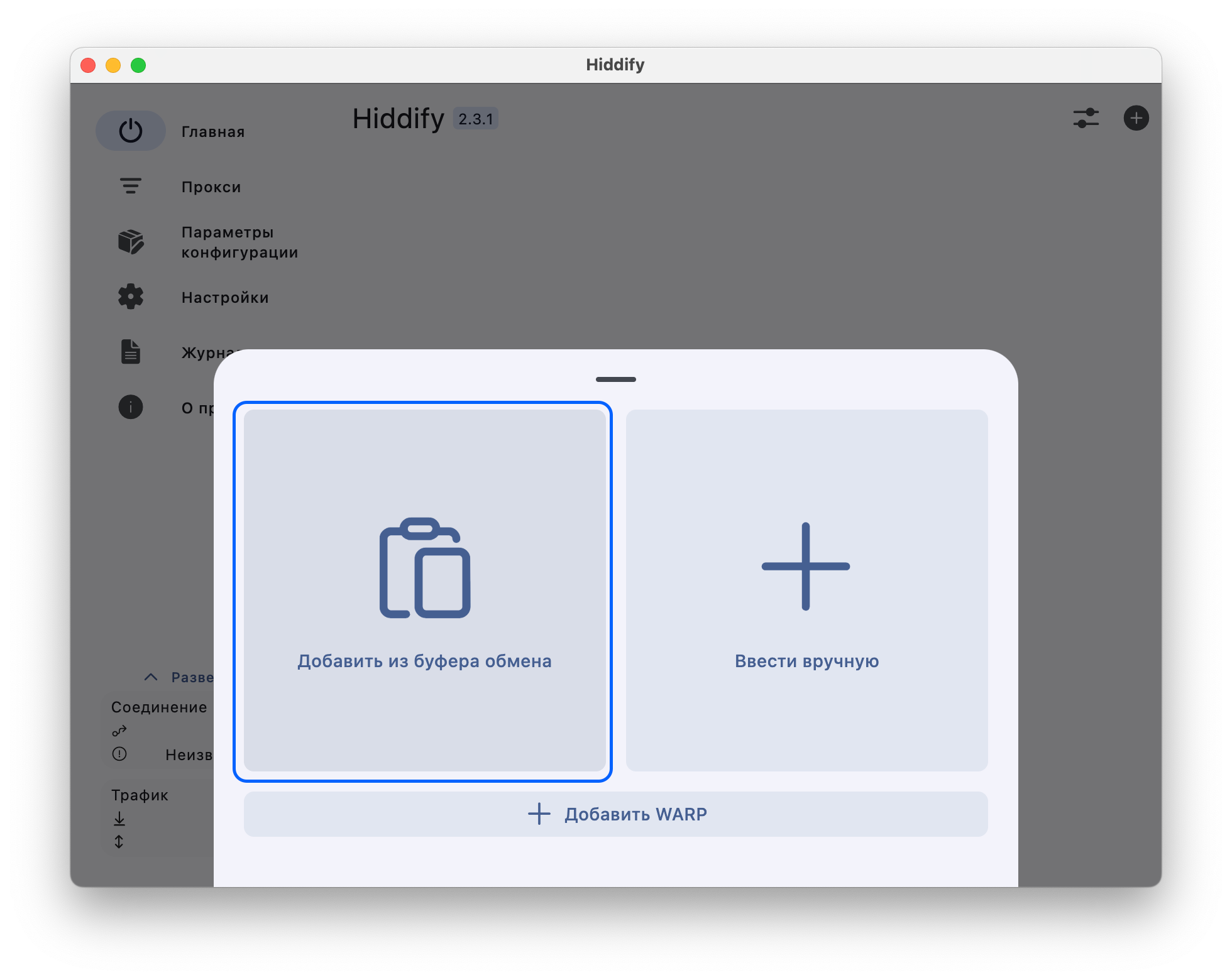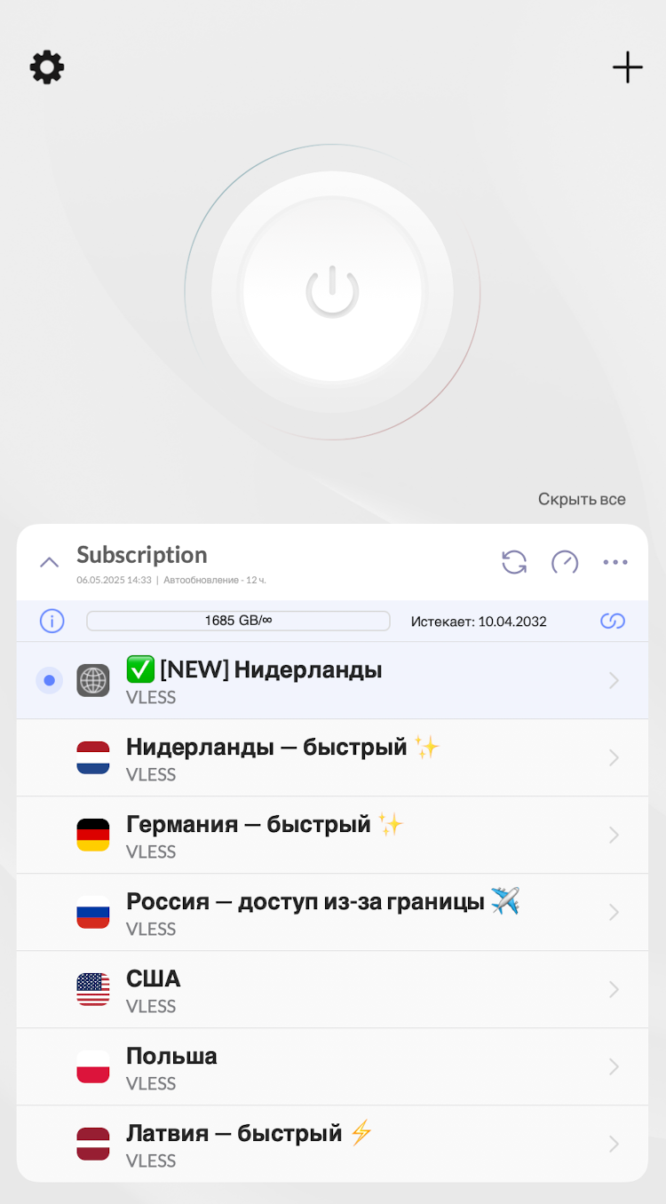 Если не получается добавить «Из буфера» — нажмите на кнопку «+» в верхнем углу, выберите «URL подписки» и введите скопированную ссылку на подписку -> нажмите на кнопку «Готово».